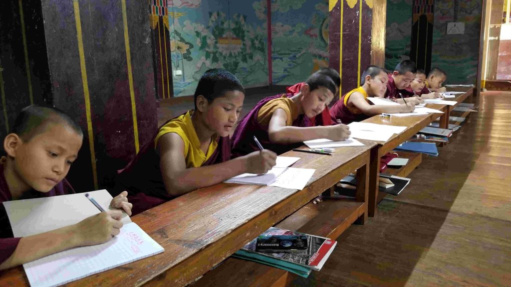 As well as learning all the subjects necessary for a monk’s life which include Tibetan, the memorization of Buddhist texts and rituals, the young monks also learn a variety of other subjects and tasks: the proper care of the shrine and participation in the daily and special pujas and rituals. They learn to play the musical instruments for puja as well as their studies of English and proper behavior in the various rituals. The young monks as well are examined from time to time to grade their progress in various subjects. Exercise is very important and the young monks take full advantage of the playground during their day off and even on occasion celebrate various birthdays.